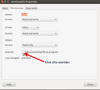 Αφού το μεταφέρετε κάνετε δεξί κλικ στο αρχείο (wireless-script) και κλικ στο properties (Ιδιότητες) , στο παράθυρο που θα ανοίξει πάτε στην καρτέλα Permissions(δικαιώματα) και μαρκάρετε το κουτάκι «Allow executing file as program» (να επιτρέπεται η εκτέλεση του αρχείου ως πρόγραμμα).