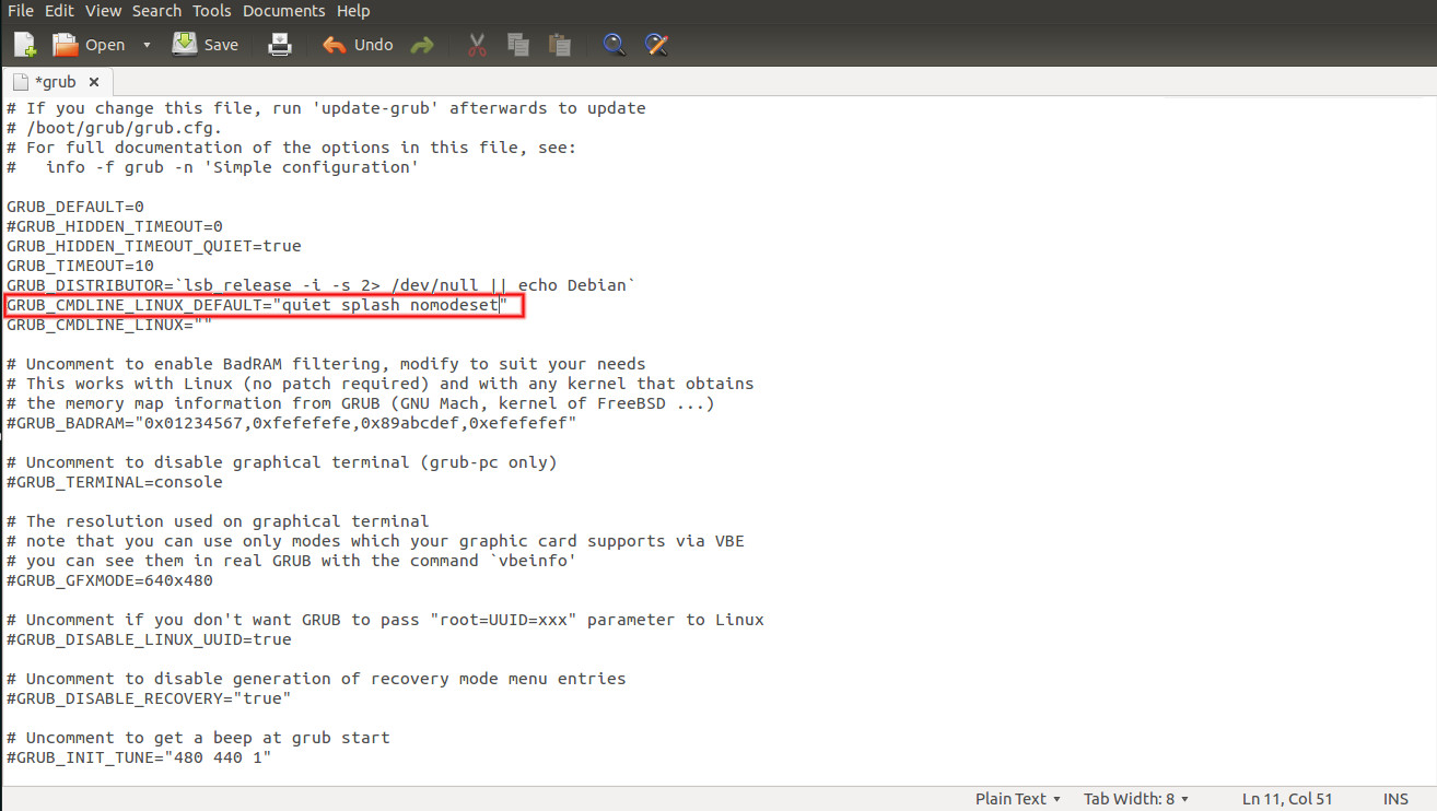 Έτσι οι αλλαγές μας αποθηκεύονται και σε κάθε εκκίνηση θα ισχύει η παράμετρος που θέσαμε. Στην παραπάνω εικόνα έχουμε θέσει την nomodeset.