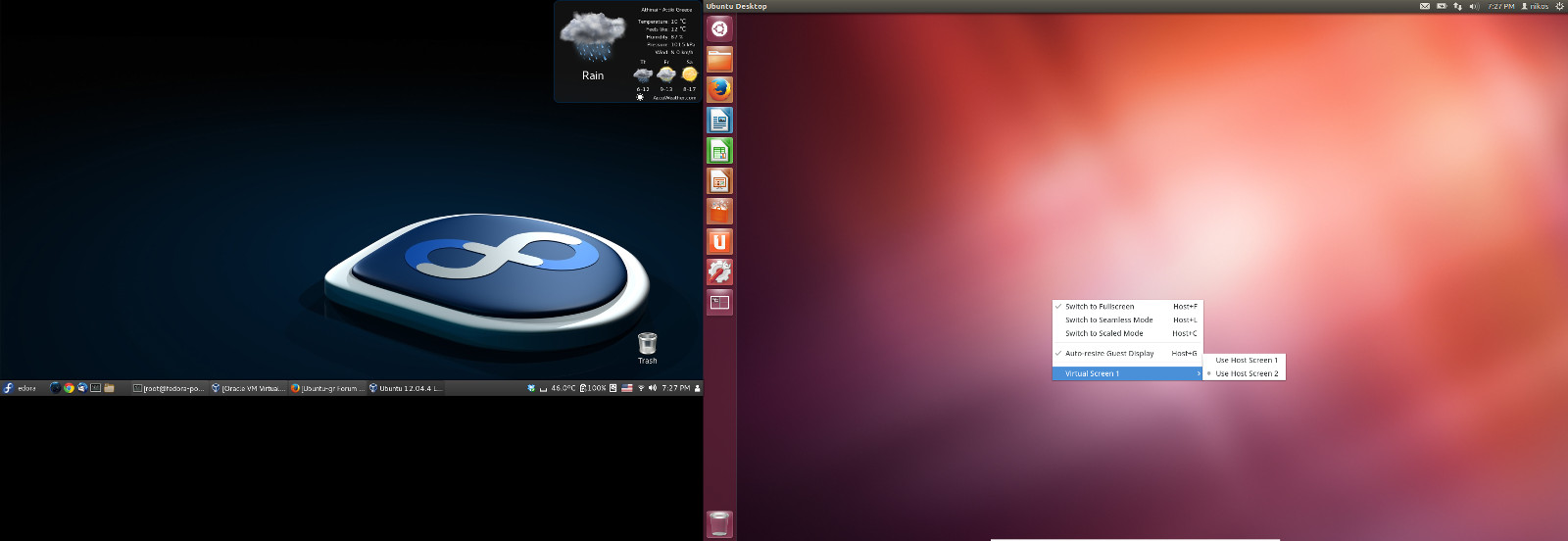 Και μια εικόνα με dual monitors setup και Fedora 20 host με Ubuntu 12.04.4 LTS guest.