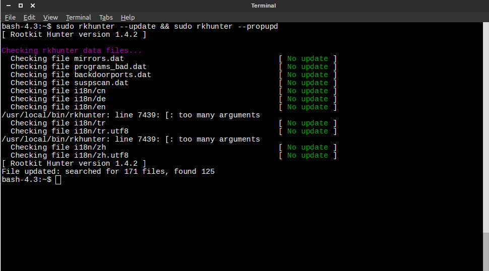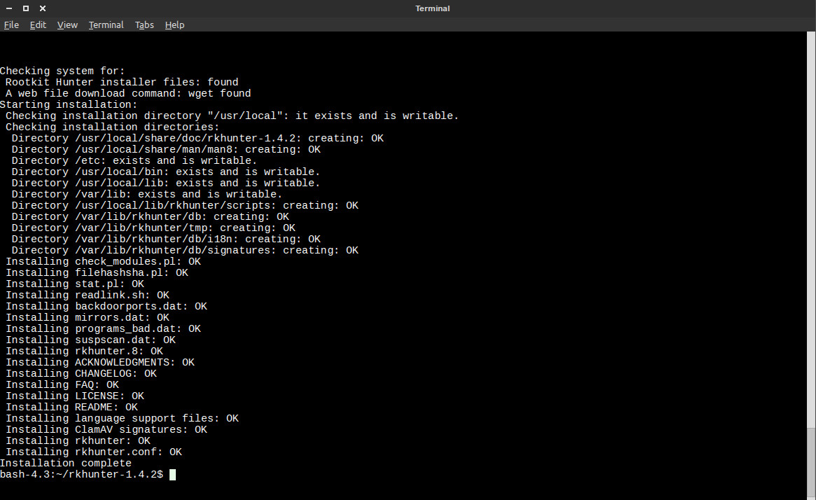 tar xvf rkhunter-1.4.2.tar.gz cd rkhunter-1.4.2/ sudo ./installer.sh --install