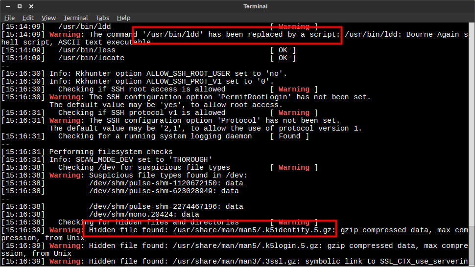 Θα δούμε warnings όπως τα παραπάνω τα οποία πρέπει να εξετάσουμε. Γνωρίζοντας ότι για παράδειγμα το /usr/bin/ldd είναι εντάξει και ότι το κρυφό αρχείο /usr/share/man/man5/.k5identity.5.gz δεν αποτελεί πρόβλημα, θα επεξεργαστούμε κατάλληλα το αρχείο ρυθμίσεων του rkhunter (/etc/rkhunter.conf ή /usr/local/etc/rkhunter.conf) για να προσθέσουμε εξαιρέσεις για τα συγκεκριμένα αρχεία.