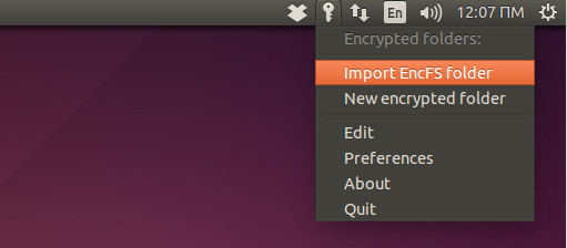 Για να ρυθμίσουμε σωστά το cryptkeeper και να το αντιστοιχήσουμε με τους ήδη υπάρχοντες καταλόγους μας, κάνουμε κλικ στο κλειδί (ή λουκέτο) και έπειτα στο «Import EncFS folder».