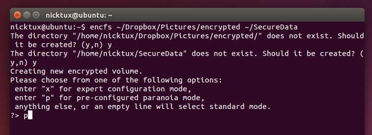 encfs ~/Dropbox/Pictures/encrypted ~/SecureData
