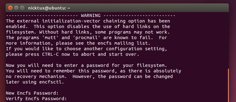 Εκεί διατηρούνται «ζωτικές» πληροφορίες για την σωστή λειτουργία του EncFS. Σε περίπτωση που χαθεί το συγκεκριμένο αρχείο, πιθανότατα δεν θα έχετε πρόσβαση στα κρυπτογραφημένα αρχεία σας. Οπότε, δημιουργήστε ένα αντίγραφο ασφαλείας(backup) του συγκεκριμένου αρχείου κάπου αλλού.