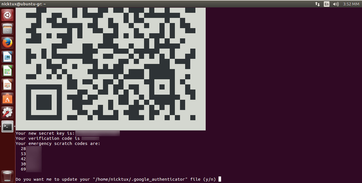 Όταν τρέξουμε την εντολή google-authenticator στο τεματικό, ξεκινά στην ουσία και η ρύθμιση της εφαρμογής. Θα παραχθεί αμέσως ένα barcode, καθώς και ένα μυστικό κλειδί. Επίσης θα παραχθούν και κάποιοι κωδικοί ασφαλείας(emergency scratch codes) σε περίπτωση που δεν λειτουργεί (για όποιον λόγο) η εφαρμογή. Φυλάξτε αυτούς τους κωδικούς, διότι ίσως να χρειαστούν.