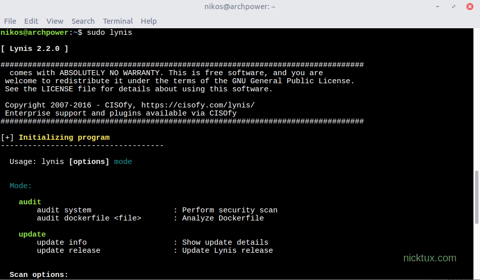Είμαστε έτοιμοι με την εγκατάσταση. Ναι ΟΚ, δεν είναι διαδικασία εγκατάστασης ακριβώς, απλά κατεβάσαμε το συμπιεσμένο αρχείο από το Official site και το αποσυμπιέσαμε σε έναν κατάλογο, έπειτα φτιάξαμε ένα symlink το οποίο κατά 99% περιλαμβάνεται στην PATH, οπότε και δεν θα χρειάζεται να μπαίνουμε στον κατάλογο του Lynis κάθε φορά για να το τρέξουμε.