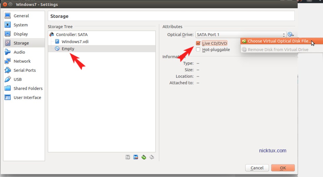 Στη συνέχεια κάνουμε κλικ στο Empty και επιλέγουμε το κουτί LiveCD/DVD. Έπειτα κάνουμε κλικ στο εικονίδιο με το δισκάκι και επιλέγουμε «Choose Virtual Optical Disk File». Κάνοντας κλικ εκεί, θα ανοίξει ο διαχειριστής αρχείων και φακέλων. Πρέπει να περιηγηθούμε στη τοποθεσία που έχουμε αποθηκεύσει την εικόνα ISO των Windows και να την επιλέξουμε. Αυτή είναι και η λεγόμενη προσάρτηση.