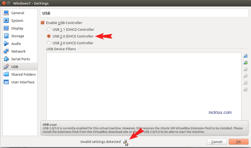 Με το που κάνουμε κλικ στο κουμπί ενεργοποίησης, θα δούμε ένα τρίγωνο προειδοποίησης κάτω, για λαθεμένες ρυθμίσεις. Αυτό συμβαίνει διότι το VirtualBox υποστηρίζει μόνο τον απαρχαιωμένο USB1 Controller. Για να ενεργοποιήσουμε την υποστήριξη για τους νεότερους, πρέπει να εγκαταστήσουμε ένα πακέτο ονόματι VirtualBox Extension Pack.