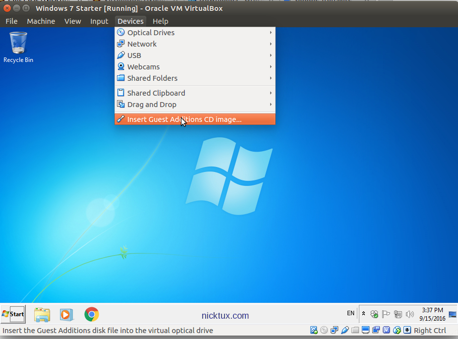 Κάνουμε κλικ στο Devices και έπειτα στο «Insert Guest Additions CD Image». Έπειτα προχωράμε στην εγκατάσταση όπως και σε κάθε άλλο πρόγραμμα των Windows. Όταν ολοκληρωθεί, κάνουμε επανεκκίνηση την εικονική μηχανή.