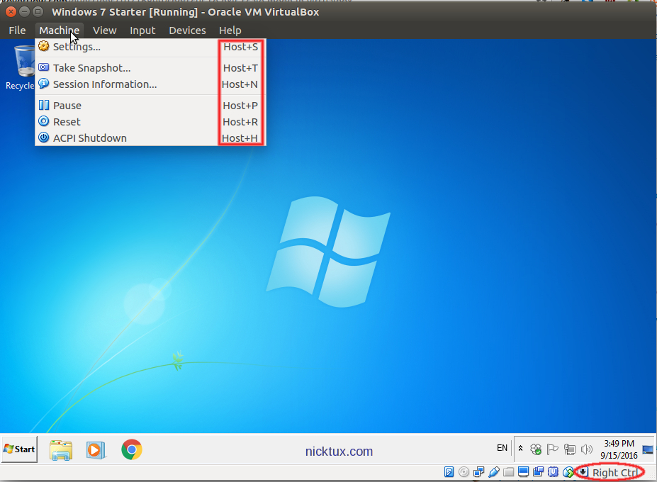 Να θυμόμαστε ότι: Το δεξί CTRL πλήκτρο είναι το λεγόμενο Host Key. Με αυτό και σε συνδυασμό με άλλα πλήκτρα, ενεργοποιούμε διάφορες δυνατότητες του VirtualBox, όπως Full-screen Mode, Seamless Mode, Snapshots…κλπ. Με ένα πέρασμα του κέρσορα του ποντικιού σε διάφορα μενού της toolbar, θα δούμε και τα διαθέσιμα shortcuts. Εκεί που γράφει Host, εννοεί το Δεξί CTRL πλήκτρο.