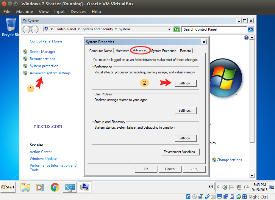 Πατώντας στο Start → δεξί κλικ στο Computer → και properties(ιδιότητες), θα ανοίξει ο πίνακας ελέγχου στις βασικές πληροφορίες συστήματος. Εκεί, κάνουμε κλικ στο Advanced System Settings (Επιλογές για προχωρημένους). Το παράθυρο που θα ανοίξει θα είναι ήδη στη καρτέλα Advanced (Για προχωρημένους) κι εκεί επιλέγουμε το Settings (Ρυθμίσεις), στη πρώτη παράγραφο Performance (Επιδόσεις).