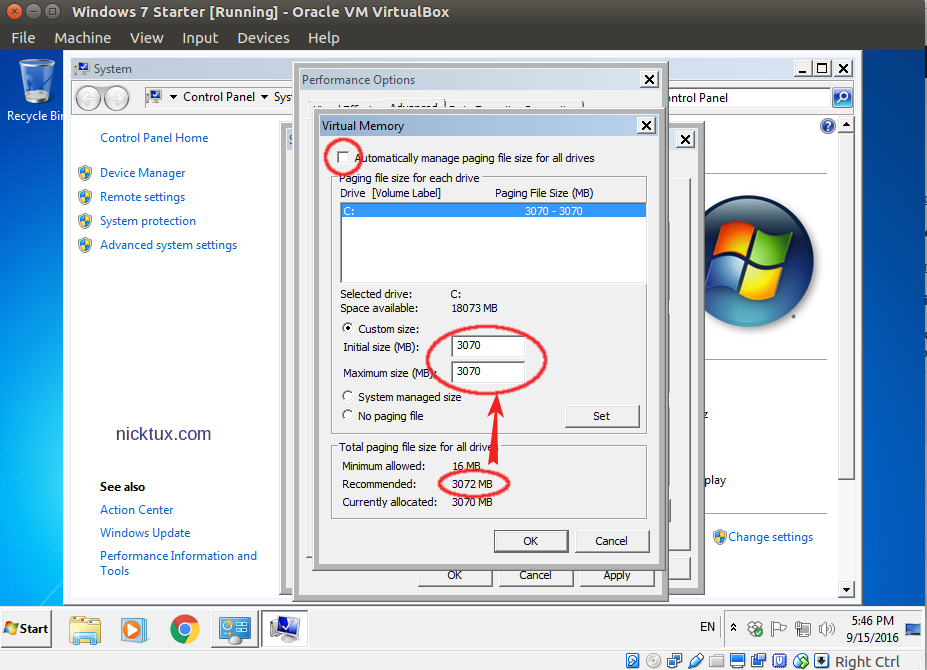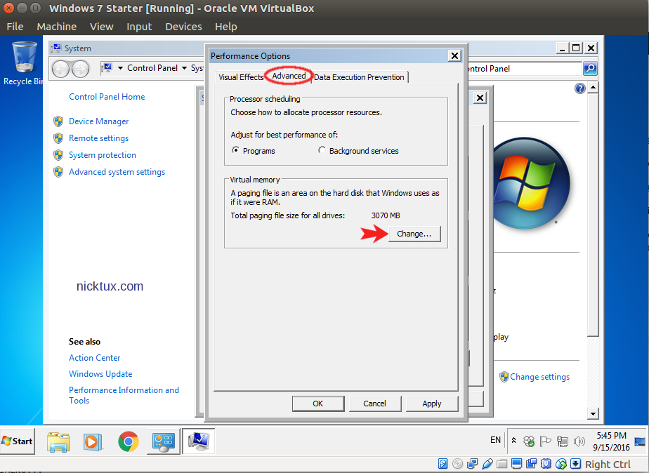 Στην επόμενη καρτέλα «Advanced», μπορούμε να ορίσουμε το μέγεθος του Paging File το οποίο βοηθά σε περίπτωση έλλειψης φυσικής μνήμης. Εδώ βέβαια μιλάμε για την εικονική (στα Windows φαίνεται ως φυσική) μνήμη που έχουμε ορίσει στο Virtual Machine.