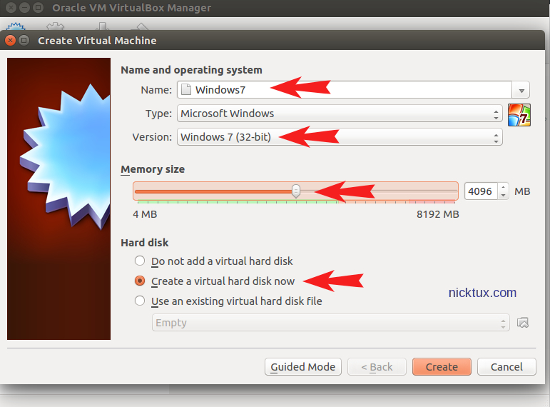 Στην επόμενη οθόνη συμπληρώνουμε το όνομα(Name) του Virtual Machine, επιλέγουμε την έκδοση(Version) του λειτουργικού που θα κάνουμε εγκατάσταση, χορηγούμε τη μνήμη (Memory size) την οποία θα δανείζεται το GuestOS από το HostOS και αφήνουμε την επιλογή δημιουργίας εικονικού δίσκου (Hard disk) ως έχει