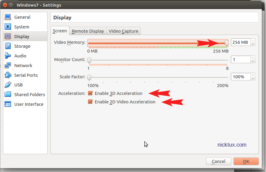 Στην επόμενη ενότητα Display και στη πρώτη καρτέλα Screen κάνουμε τις ρυθμίσεις της εικονικής κάρτας γραφικών. Παραχωρούμε όλο το διαθέσιμο μέγεθος και ενεργοποιούμε το Acceleration για 3D και 2D.