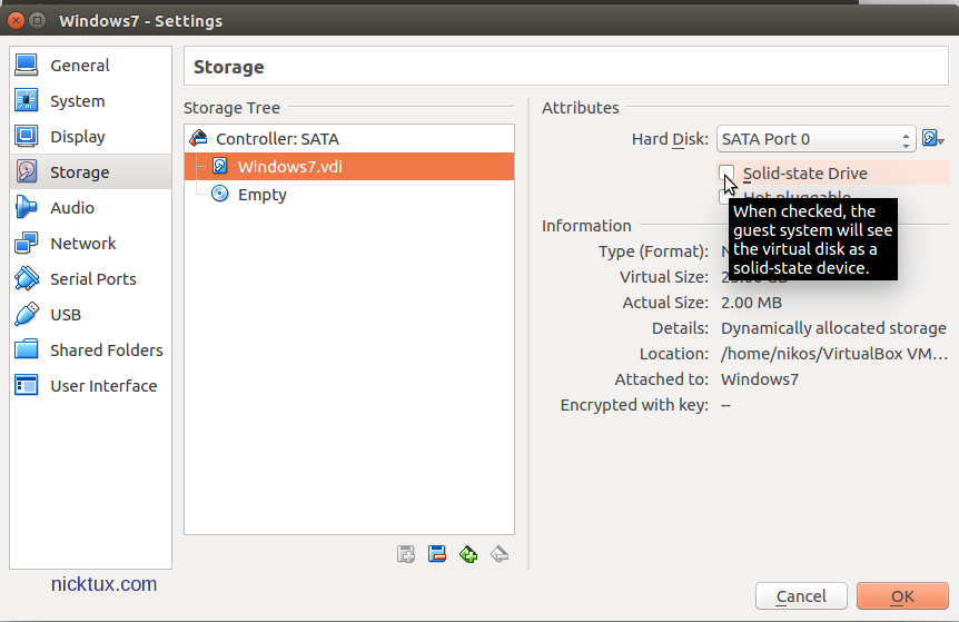 Στην ενότητα Storage και και στο Windows7.vdi (όπου υποδηλώνει τον εικονικό σκληρό δίσκο που δημιουργήσαμε προηγουμένως), επιλέγουμε εάν πρόκειται για SSD ή όχι. Εάν τον εικονικό δίσκο τον δημιουργήσαμε σε μια τοποθεσία μέσα στον πραγματικό μας SSD, τότε είναι καλό να επιλέξουμε το Solid-state Drive. Διαφορετικά το αφήνουμε ως έχει.