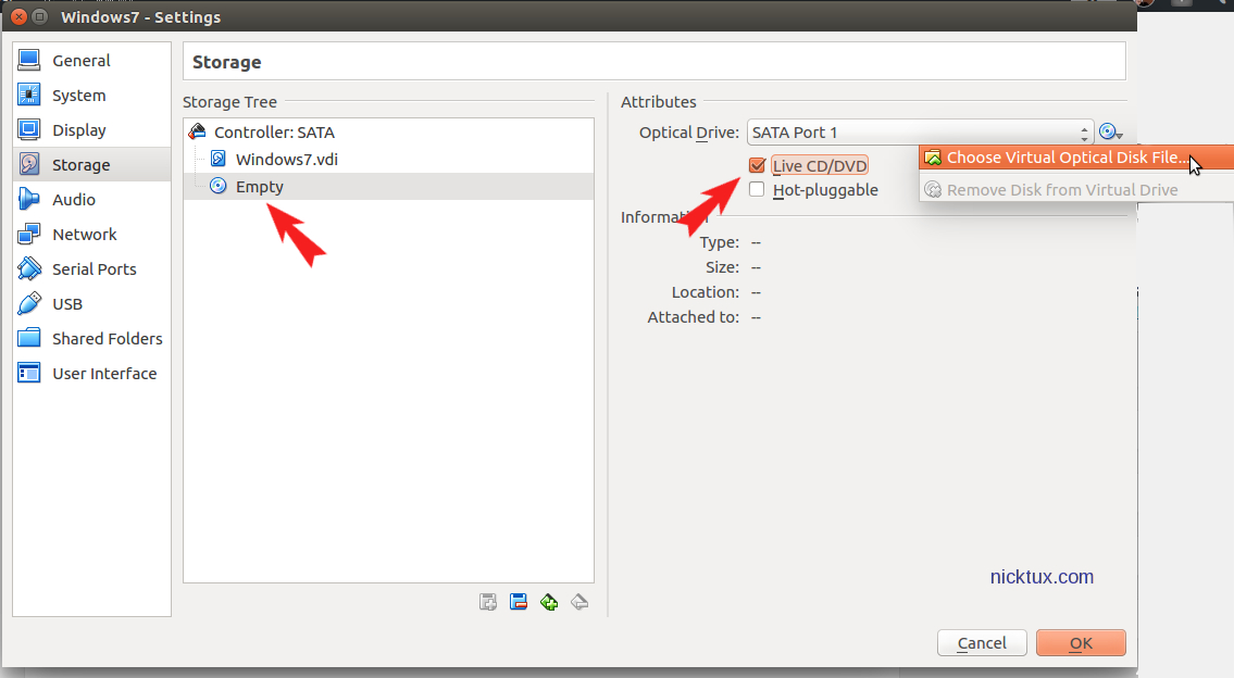 Στη συνέχεια κάνουμε κλικ στο Empty και επιλέγουμε το κουτί LiveCD/DVD. Έπειτα κάνουμε κλικ στο εικονίδιο με το δισκάκι και επιλέγουμε «Choose Virtual Optical Disk File». Κάνοντας κλικ εκεί, θα ανοίξει ο διαχειριστής αρχείων και φακέλων. Πρέπει να περιηγηθούμε στη τοποθεσία που έχουμε αποθηκεύσει την εικόνα ISO των Windows και να την επιλέξουμε. Αυτή είναι και η λεγόμενη προσάρτηση.