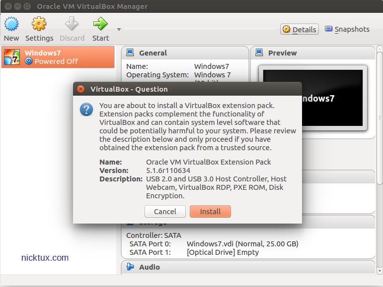 Σε περίπτωση που υπάρξει νέα έκδοση του Extension Pack, αυτό θα το καταλάβουμε από το τρίγωνο προειδοποίησης στο VirtualBox. Δηλαδή, εάν έχουμε παλαιότερη έκδοση Extension Pack, θα μας προειδοποιεί για λαθεμένες ρυθμίσεις. Πηγαίνοντας στη σελίδα λήψης, κατεβάζουμε το νέο Extesion Pack και το κάνουμε εγκατάσταση όπως έχουμε ήδη δείξει.