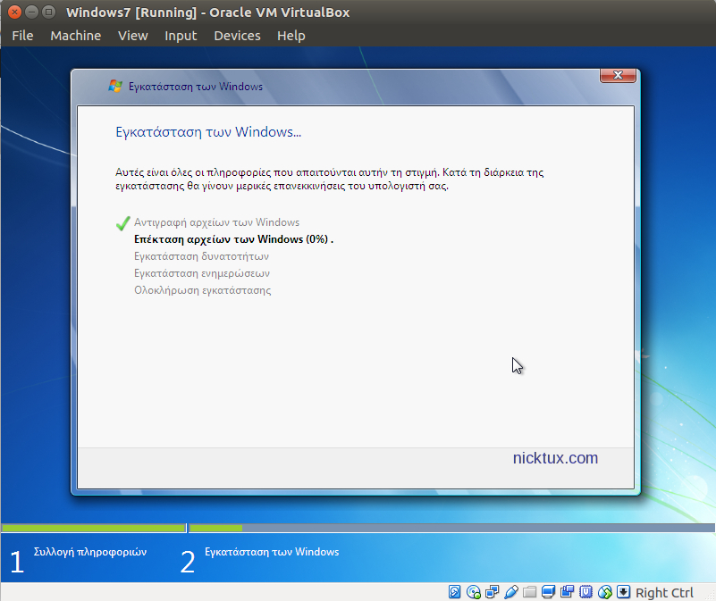 Αφού έχουμε ολοκληρώσει τις απαιτούμενες ρυθμίσεις, στην αρχική οθόνη πατάμε το κουμπί Start(πράσινο βέλος) και θα πρέπει να εκκινήσει η εικονική μας μηχανή, κάνοντας εκκίνηση πρώτα από το CD/DVD. Εκεί, έχουμε κάνει προσάρτηση την εικόνα ISO των Windows και θα ξεκινήσει η διαδικασία εγκατάστασης. Δεν αλλάζει κάτι σε ότι αφορά την εγκατάσταση των Windows. Κάνουμε εγκατάσταση όπως θα κάναμε σε έναν κανονικό υπολογιστή.