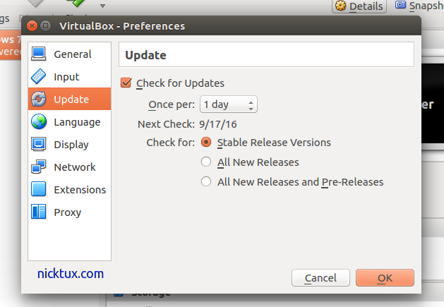 Σε ότι αφορά την αναβάθμιση του VirtualBox, ανοίγοντας το File → Preferences θα δούμε στην ενότητα Updates ότι είναι επιλεγμένο το κουτί για έλεγχο νέων εκδόσεων καθημερινά. Όταν κάποια στιγμή υπάρξει νέα έκδοση, θα λάβουμε τη σχετική ειδοποίηση. Η αναβάθμιση δεν είναι δύσκολη. Θα επιλέξουμε να κατεβάσει το αρχείο και έπειτα μπορούμε να ακολουθήσουμε πάλι τη διαδικασία εγκατάστασης (μια εντολή).