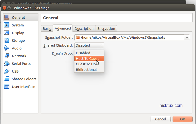 Πηγαίνοντας στην ενότητα General και στη δεύτερη καρτέλα Advanced, μπορούμε να δούμε τη τοποθεσία αποθήκευσης ενός Snapshot, καθώς και ρυθμίσεις συμπεριφοράς του Host και του Guest, δηλαδή πως αλληλεπιδρούν μεταξύ τους.