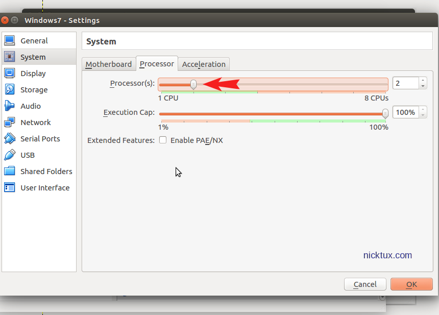 Στη καρτέλα Processor, μπορούμε να κατανείμουμε τον αριθμό των επεξεργαστών που θα δανείζεται το GuestOS από το HostOS. Ως γενικό κανόνα μπορούμε να ακολουθούμε το ήμισυ των επιτρεπόμενων διαθέσιμων επεξεργαστών. Στη συγκεκριμένη εικόνα βλέπουμε τέσσερις(4) επιτρεπόμενους διαθέσιμους(πράσινη ένδειξη) και έχουν παραχωρηθεί οι δύο(2).