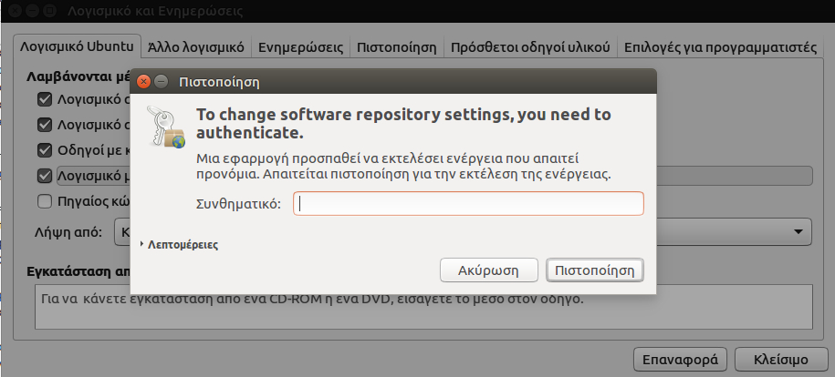 Προκειμένου να ενεργοποιήσουμε ή να απενεργοποιήσουμε κάποια από τα αποθετήρια, θα μας ζητηθεί ο κωδικός του Administrator (στο Ubuntu, Administrator είναι ο χρήστης μας).