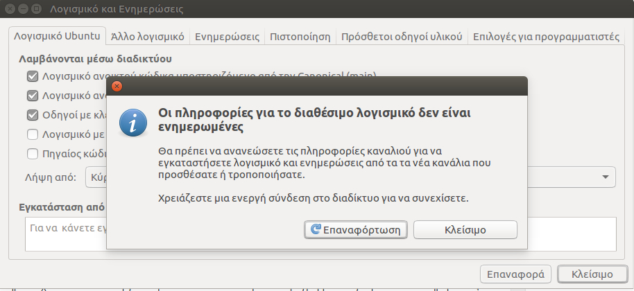 Το αποθετήριο έχει πλέον απενεργοποιηθεί. Όταν κλείσουμε το πρόγραμμα «Λογισμικό και Ενημερώσεις» θα μας ζητηθεί να κάνει ενημέρωση των καναλιών (αποθετηρίων). Πατάμε «Επαναφόρτωση». Με αυτό τον τρόπο θα δημιουργηθούν εκ νέου οι πηγές λογισμικού, δηλαδή οι τοποθεσίες από τις οποίες λαμβάνουμε λογισμικό για το Ubuntu, χωρίς να συμπεριλαμβάνεται σε αυτές το αποθετήριο multiverse το οποίο απενεργοποιήσαμε.