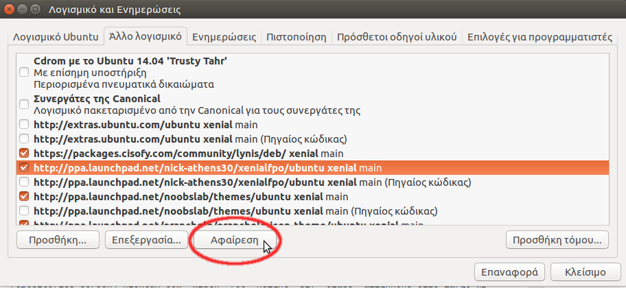 Με παρόμοιο τρόπο μπορούμε να αφαιρέσουμε ένα αποθετήριο από το σύστημά μας. Επιλέγοντάς το και πατώντας το κουμπί «Αφαίρεση» το αποθετήριο δεν θα απενεργοποιηθεί απλά, αλλά θα απομακρυνθεί εντελώς από το σύστημά μας.