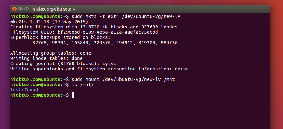 Με τη παρακάτω εντολή δημιουργούμε ένα σύστημα αρχείων ext4 για το Logical Volume new-lv.