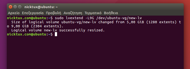 Με τη παραπάνω εντολή αλλάζουμε το συνολικό μέγεθος του new-lv από το αρχικό (5GB) σε 9GB.