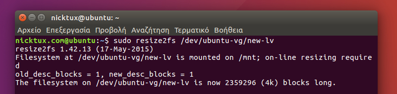 Βλέποντας την εικόνα παραπάνω θα αντιληφθούμε ότι αν και το μέγεθος του new-lv έχει γίνει όντως 9GB, όταν κάνουμε προσάρτηση το διαμέρισμα το διαθέσιμο μέγεθος είναι 4,8G (5GB). Αυτό συμβαίνει διότι ναι μεν έχουμε επεκτείνει το LV μας, αλλά όχι το σύστημα αρχείων (filesystem) που φιλοξενεί.