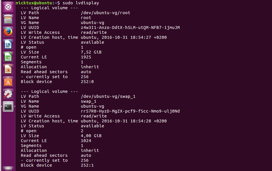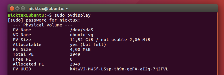 Tο Ubuntu από προεπιλογή έχει δημιουργήσει ένα φυσικό τόμο (pv), ένα γκρουπ λογικών τόμων (vg) και δυο λογικούς τόμους (lv). Ο ένας λογικός τόμος «κρατάει» το βασικό μας σύστημα (root) και ο άλλος την εικονική μνήμη swap.