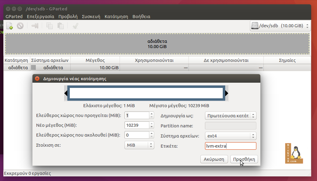 Δημιουργία διαμερίσματος και προσθήκη/επέκταση Volume Group