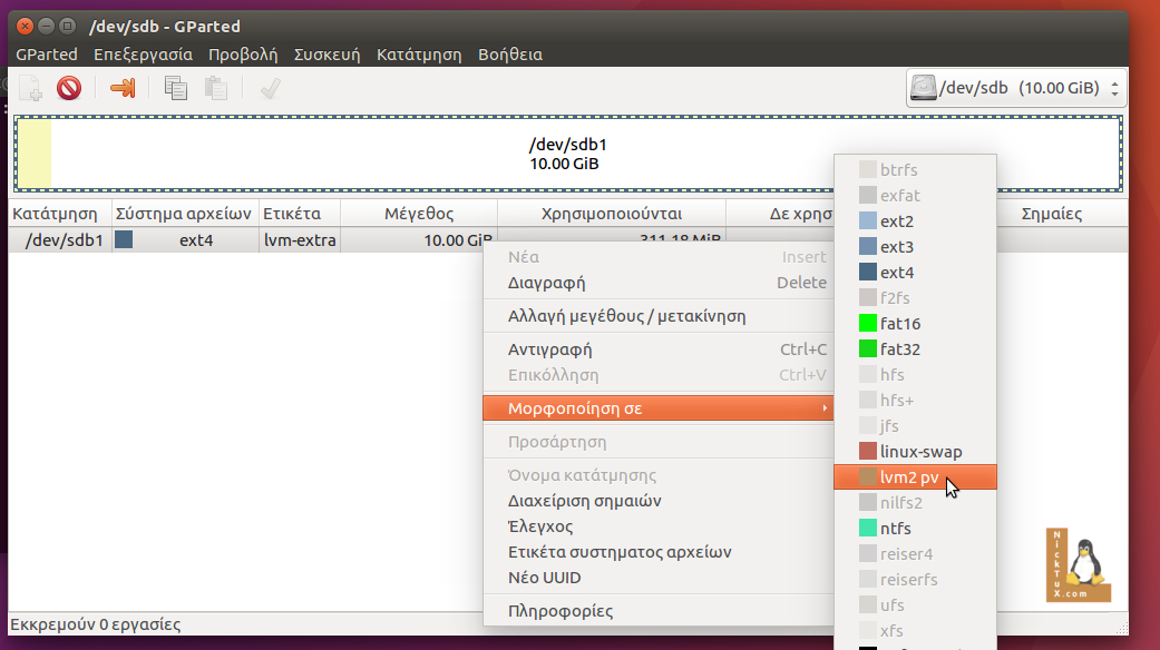 Δημιουργούμε ένα νέο διαμέρισμα στον δεύτερο σκληρό δίσκο, συστήματος αρχείων ext4 και έπειτα διαμορφώνουμε το νέο διαμέρισμα σε lvm2 pv.