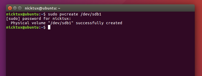 Για να γνωστοποιήσουμε στον LVM το νέο μας διαμέρισμα χρησιμοποιούμε την εντολή pvcreate, ώστε να δημιουργήσουμε τον νέο Φυσικό Τόμο.