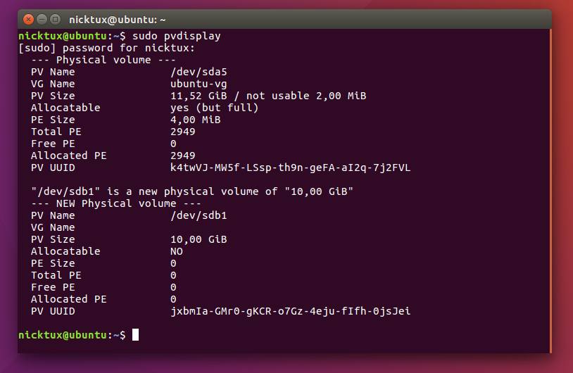 Με την εντολή pvdisplay, μπορούμε να δούμε τον νέο φυσικό τόμο που μόλις προσθέσαμε.