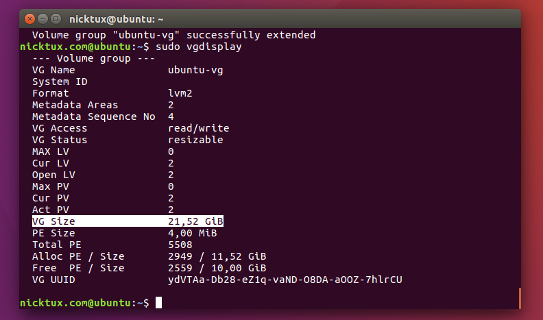 Ο λογικός τόμος new-lv έχει μέγεθος αυτή τη στιγμή 5GB. Κατά πόσο μπορούμε όμως να επεκτείνουμε τον λογικό τόμο, αυτό εξαρτάται από το πόσο χώρο διαθέτει το Volume Group. Προηγουμένως προσθέσαμε ένα Physical Volume στο Volume Group το οποίο επεκτείναμε κατά 10GB. Το συνολικό μέγεθος του VG είναι τώρα περίπου 21GB. Από αυτά τα 21GB όμως τα 11GB κατέχει το ubuntu. Είναι οι λογικοί τόμοι (LV) τους οποίους έχει δημιουργήσει το Ubuntu κατά την εγκατάσταση, από προεπιλογή.
