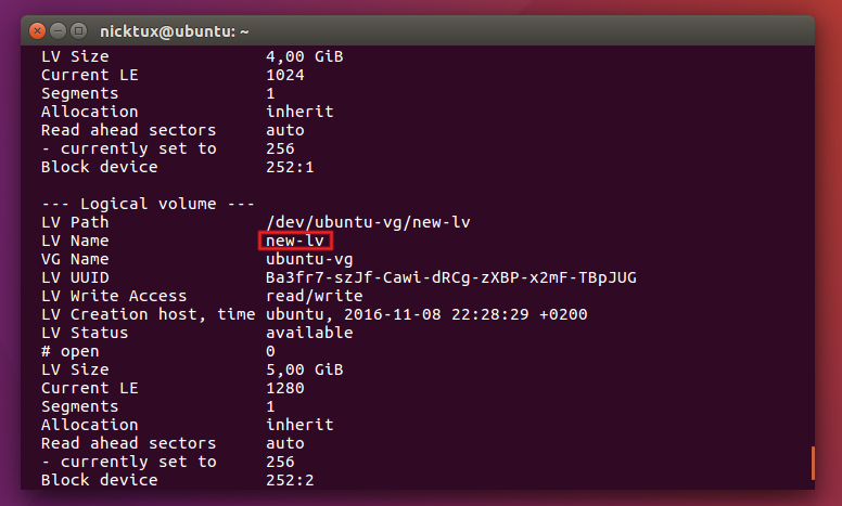 sudo lvcreate -L 5G -n new-lv ubuntu-vg
