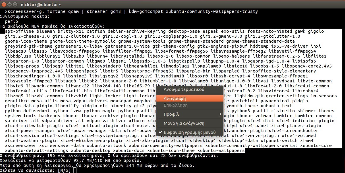 Δίνοντας την όποια εντολή εγκατάστασης ο apt (διαχειριστής πακέτων που χρησιμοποιεί το Ubuntu) πρώτα θα μας ρωτήσει για τα επιπλέον πακέτα που θα γίνουν εγκατάσταση. Πριν πατήσουμε Enter (ή Yes/Ναι) για να συνεχίσει, μπορούμε να κάνουμε μια αντιγραφή και επικόλληση σε έναν κειμενογράφο όλα τα πακέτα που πρόκειται να γίνουν εγκατάσταση.