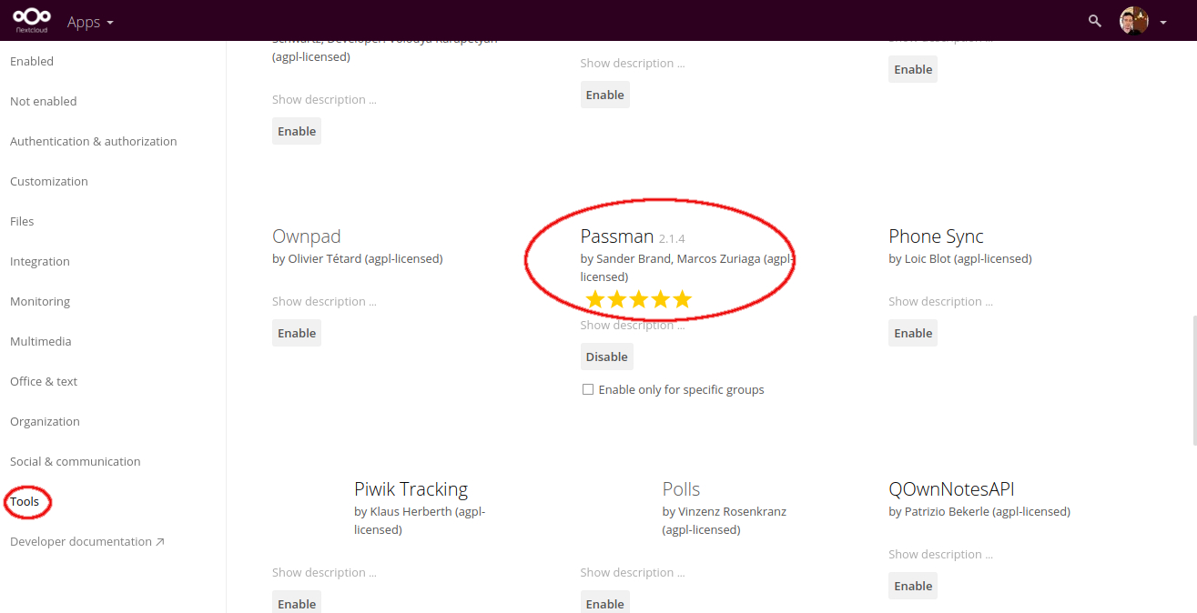 We go to Apps (+ sign), and in the Tools section, we find the Passman App. We enable it.