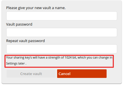 We open it, and we create our first Vault. We give it a name and a password strong enough to keep the Vault safe. Pay attention to the info about the sharing keys. We will see how to change our sharing keys strength later on.
