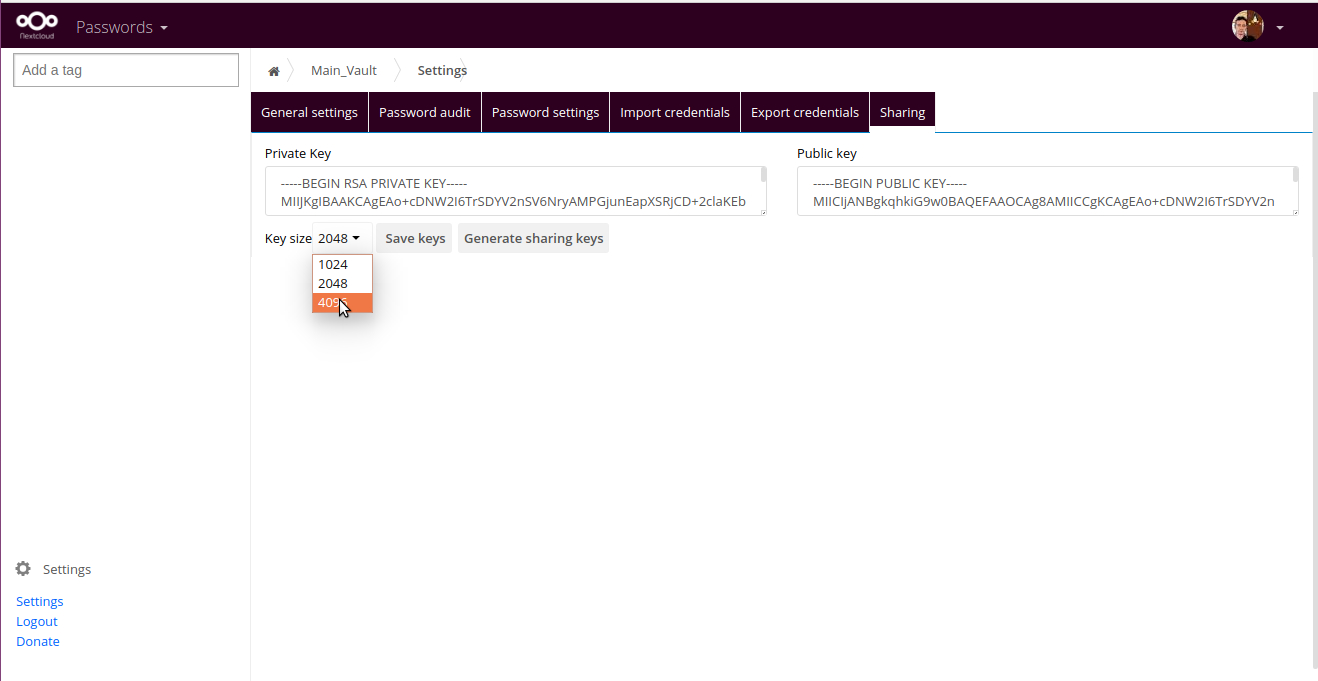 To change our sharing keys strength, go to settings (down left) and click on Sharing. There we can generate a new pair of keys with bigger key size (e.g. 4096)
