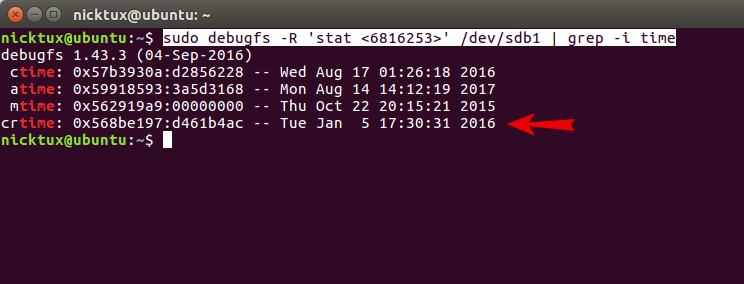 - crtime: Είναι το Creation Time και αυτό που αναζητούσαμε να βρούμε. Αυτό το οποίο δεν εκτυπώνει η stat. Η ημερομηνία δημιουργίας του αρχείου.