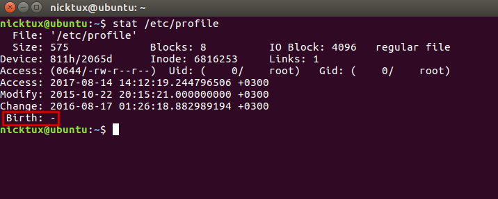 Στη παραπάνω εικόνα βλέπουμε πόσες πληροφορίες επιστρέφει η stat για το αρχείο profile. Από τα δικαιώματα Read-Write-Execute, τα uid, gid καθώς και Access, Modify και Change Time. Αυτό που δεν επιστρέφει, και είναι σημειωμένο με κόκκινο, είναι το Birth. Πότε ακριβώς δημιουργήθηκε αυτό το αρχειό στο σύστημα αρχείων;