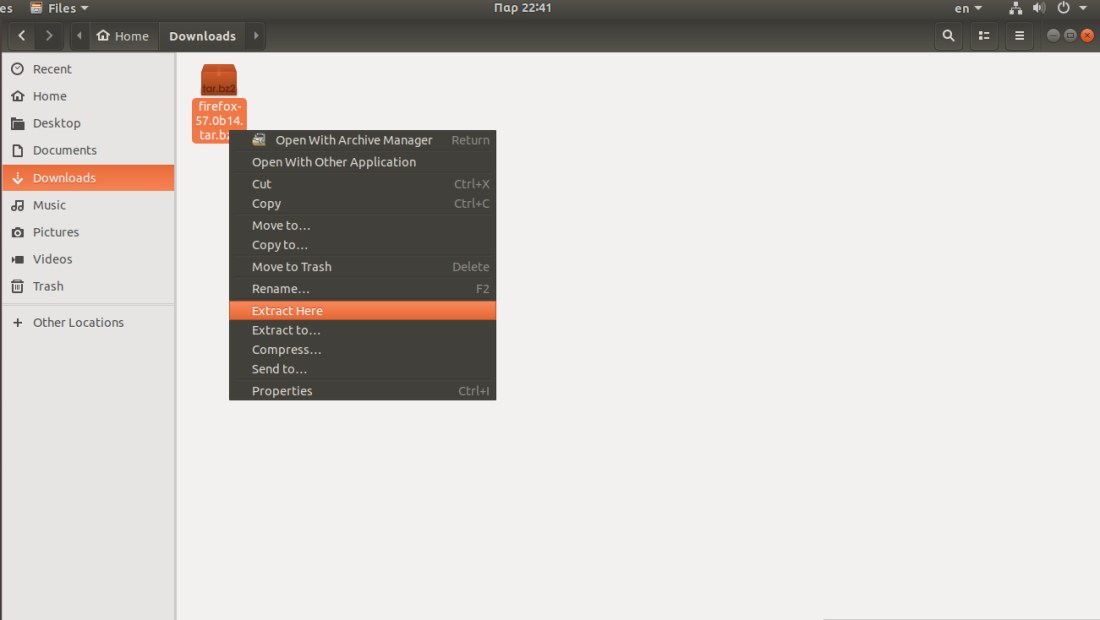 Έπειτα, το αποσυμπιέζουμε, συνήθως με δεξί κλικ επιλέγοντας «αποσυμπίεση εδώ» και έπειτα τρέχουμε το εκτελέσιμο αρχείο firefox ή firefox-bin.